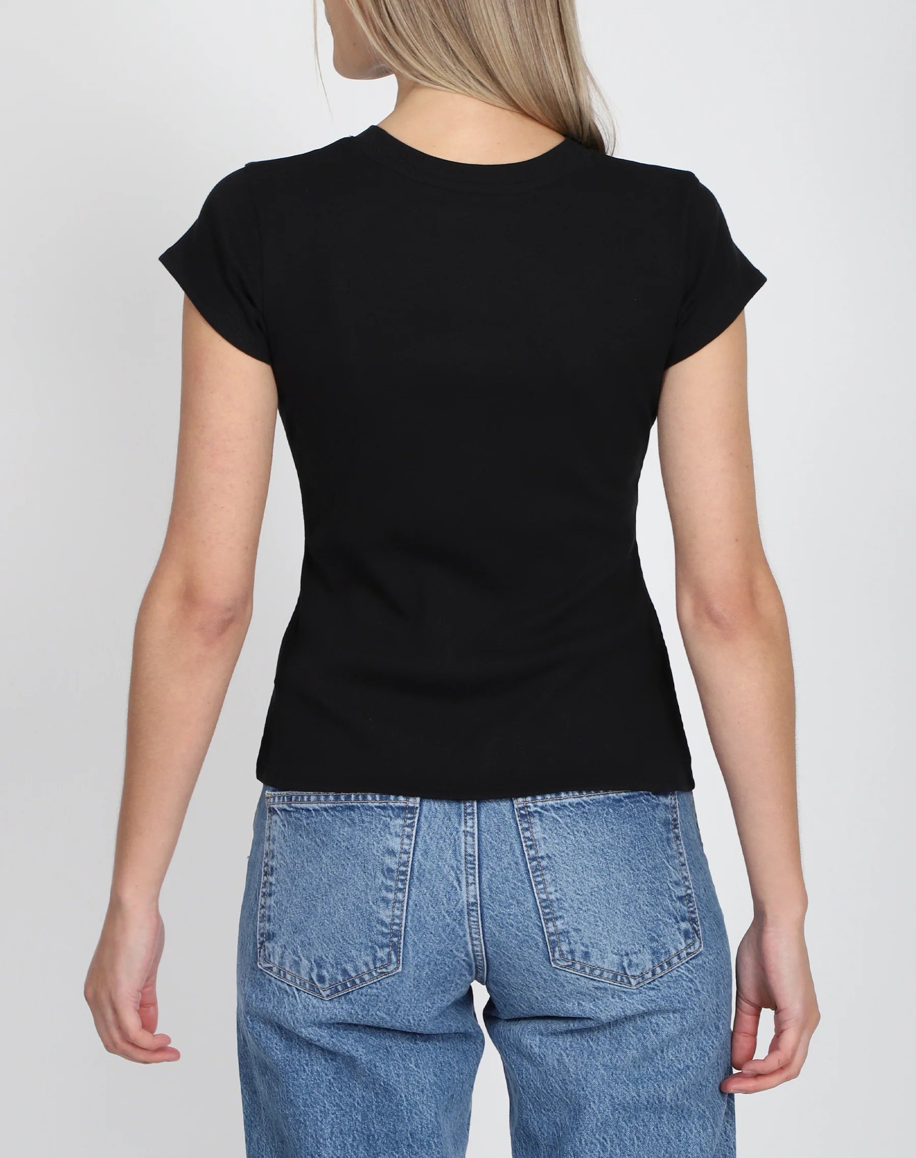 Our Ribbed Tee has a fitted body and hits just below your hips. She's made from a blend of cotton with a touch of spandex for that perfect amount of stretch. We recommend sticking true to size for this piece.