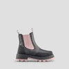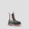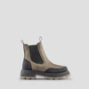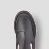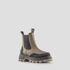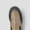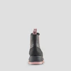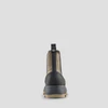 Pull-on synthetic leather and rubber boot. Rounded toe. Double elastic gore closure. Thermoplastic rubber outsole. Heel and toe scuff guard.