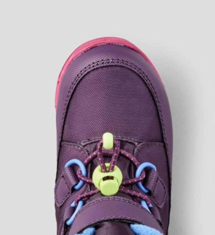 Lightweight nylon pull-on winter boot with single hook and loop strap and stretch front lace/toggle closure. Polar fleece lined collar with bellows tongue. Lightweight EVA outsole with rubber tread insert.