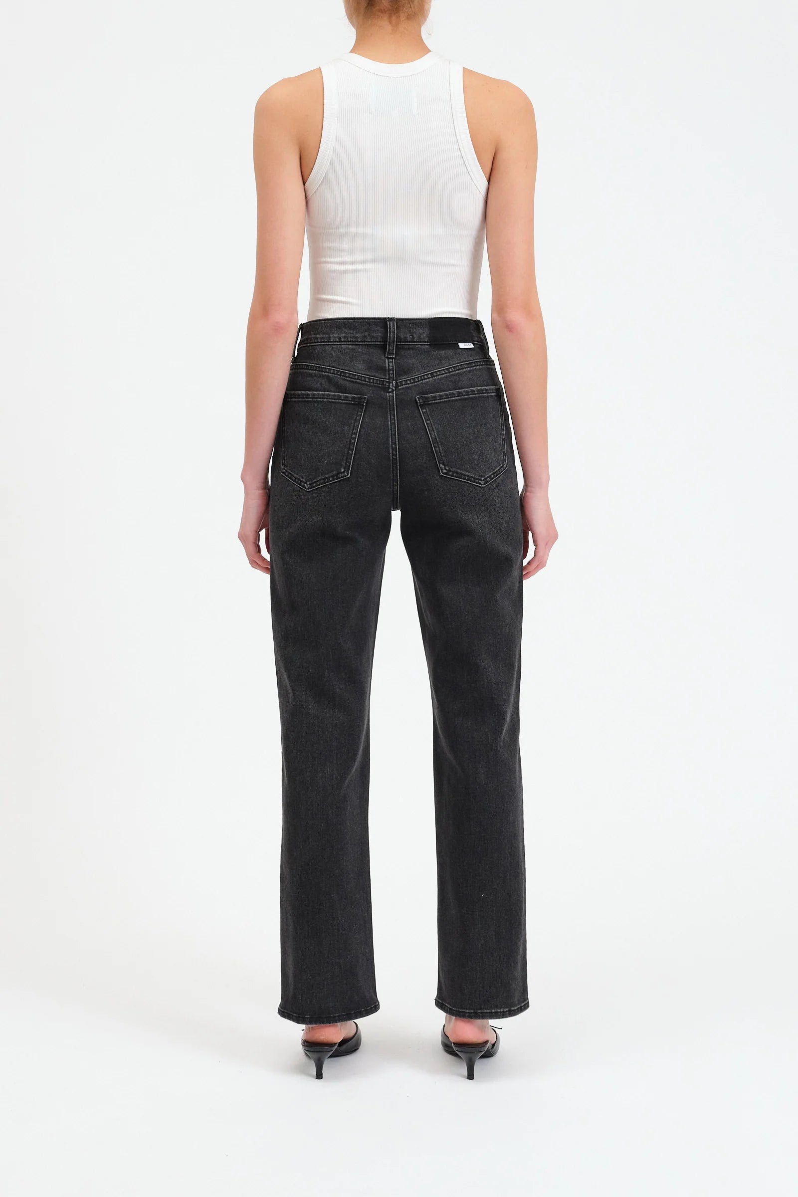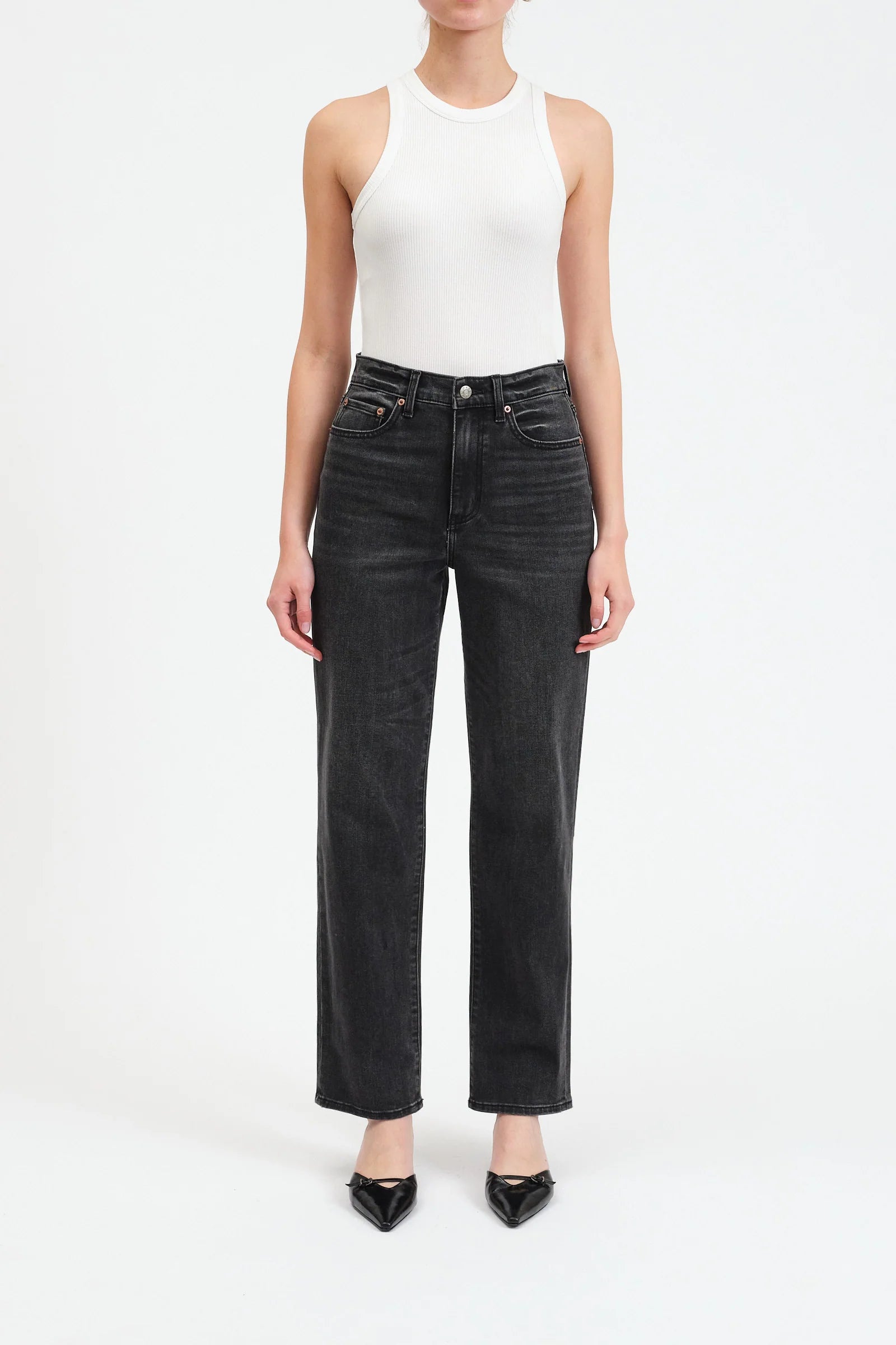 Take it easy like Sunday morning in this waist defining, straight leg in a faded black wash. Constructed in our "Repreve" denim, it is a stretch fabric created from recycled plastic.