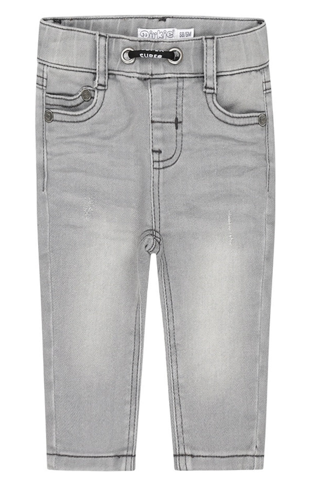 These fine Dirkje jeans with tapered fit, slightly wider at the top and a bit narrower towards the ankles, are a must-have for any boy's wardrobe. The elastic adjustable waistband ensures a perfect fit, allowing your little one to move comfortably. Made of "knitted" materials, these boys' jeans in a beautiful gray color offer optimal comfort, even for the little ones. Perfect for every day wear!