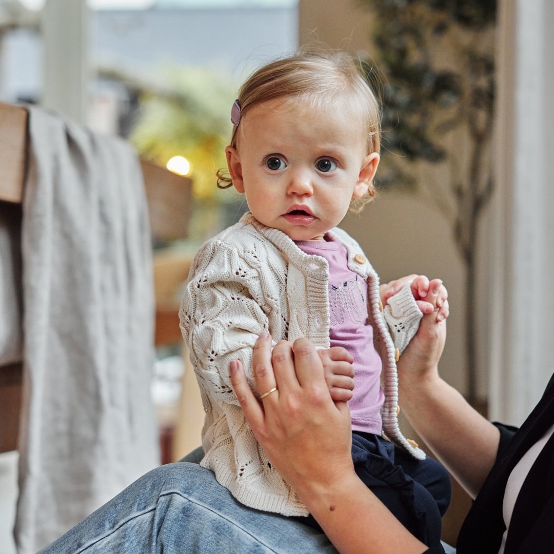 This knitted cardigan by Dirkje in the color off white will instantly give your little one's winter wardrobe a stylish upgrade! The open knitted pattern and buttons give the cardigan an elegant look, perfect for the season. This girls cardigan is ideal to pair with a pretty dress or longsleeve for a cozy, layering look.