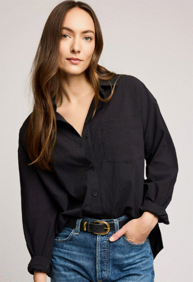 The Callahan button-down shirt is made of a cotton poplin fabric with a light crinkle texture. Features include a patch pocket and side slits.
