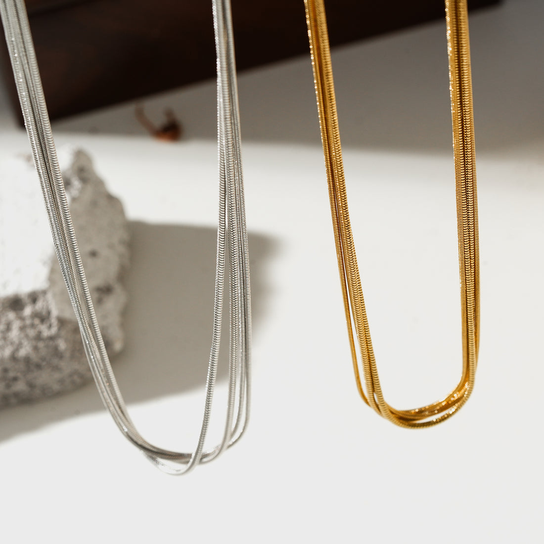 Indulge in the luxurious allure of our Snake-Skin Textured Multi-Strand Chain Necklace, a masterpiece that epitomizes sophistication and grace. This piece will elevate your look with its fusion of contemporary design and exotic appeal.