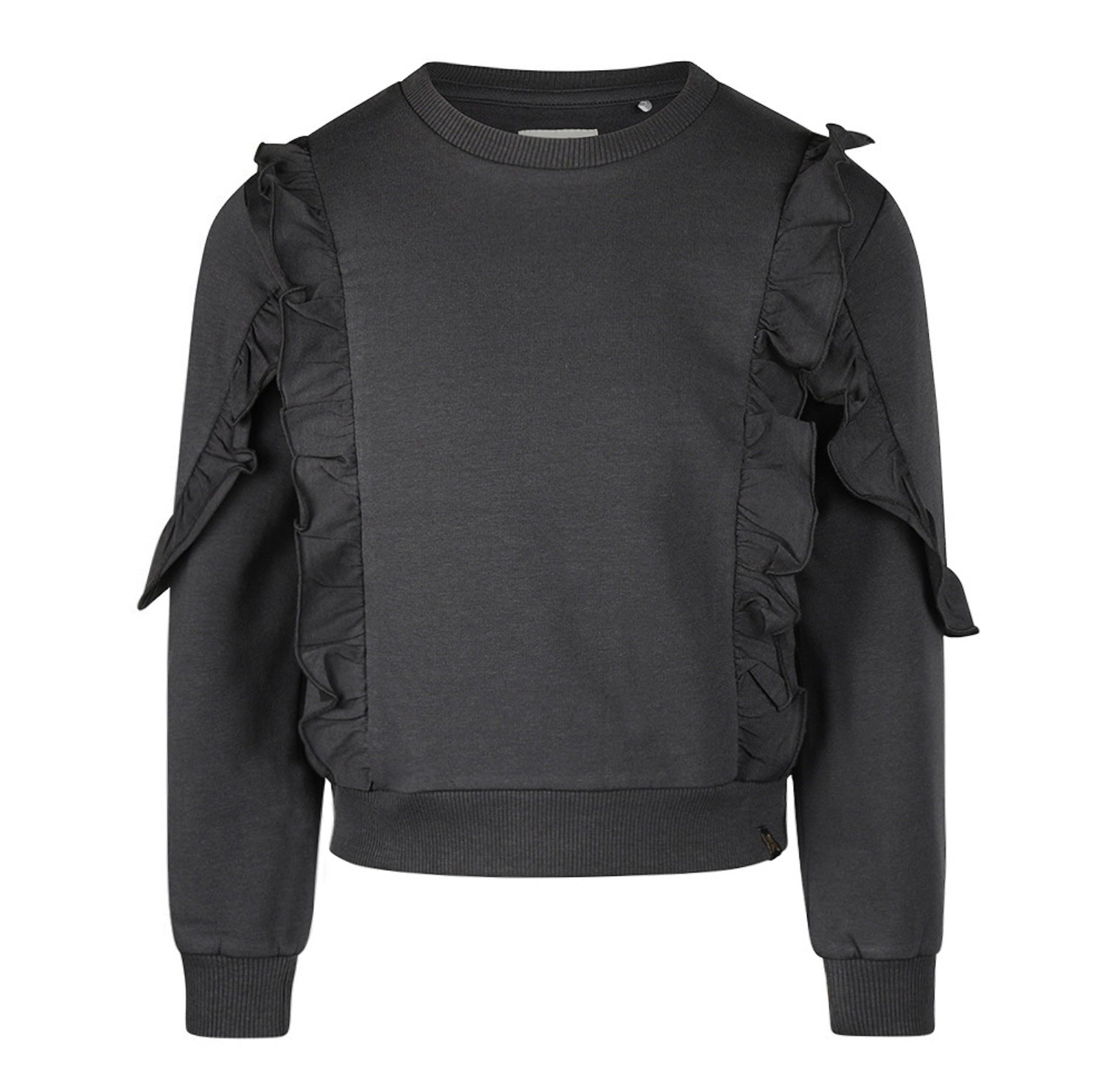Give your daughter a stylish look with this Koko Noko sweater in the trendy faded black colour. This girls' jumper stands out thanks to the playful ruffles that run across the front and sleeves. A versatile basic that pairs perfectly with jeans or a skirt. The soft fabric and comfortable fit make it ideal for everyday wear.
