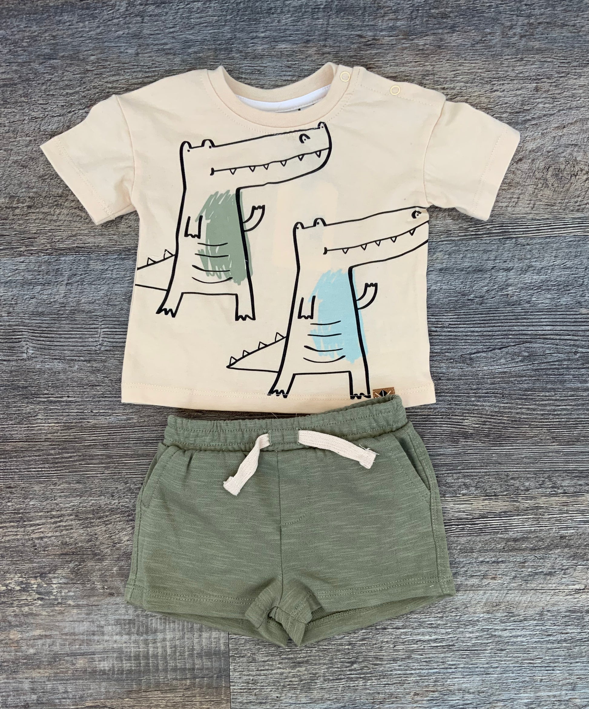 Adorable 2 piece set with Dino’s. Snaps on shoulder for easy on and off.