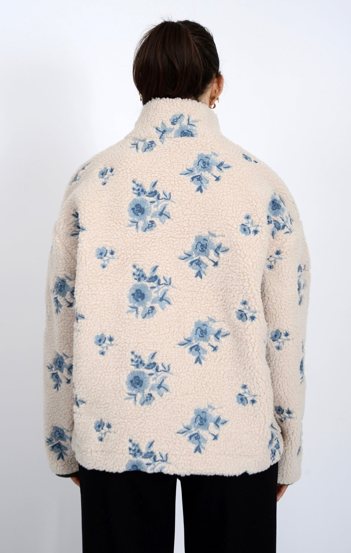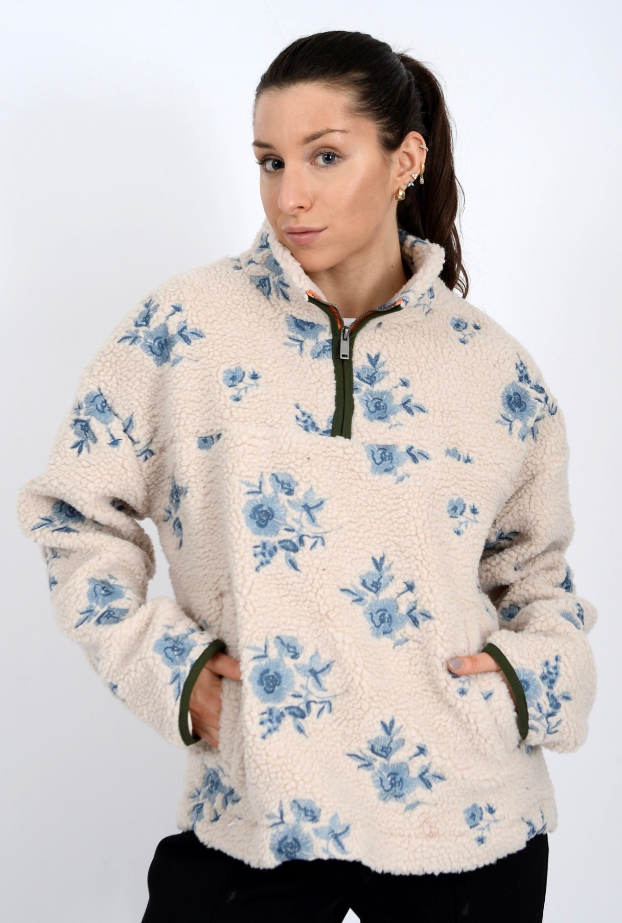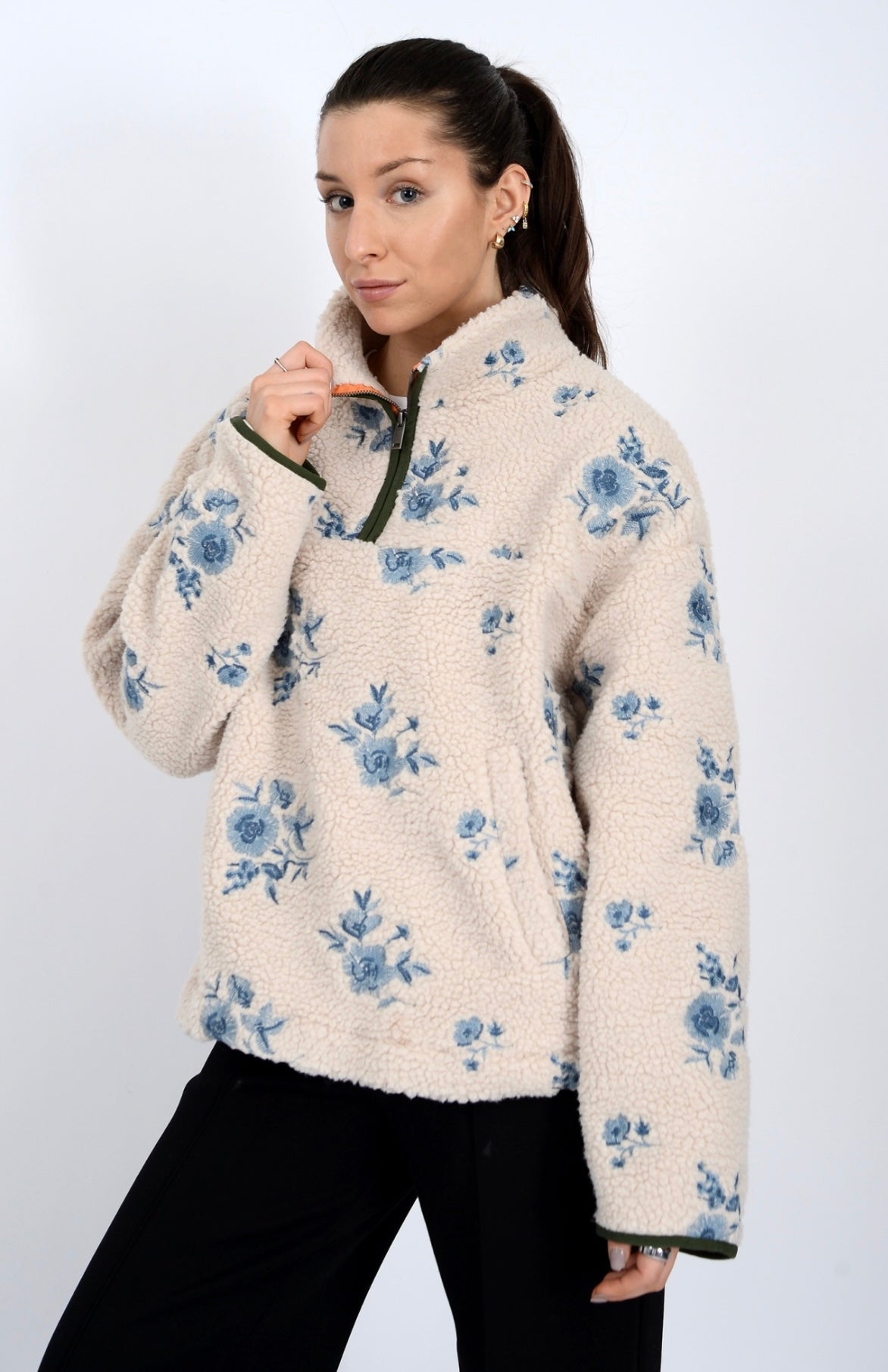 Blue poppy embroidery sherpa 1/4 zip.