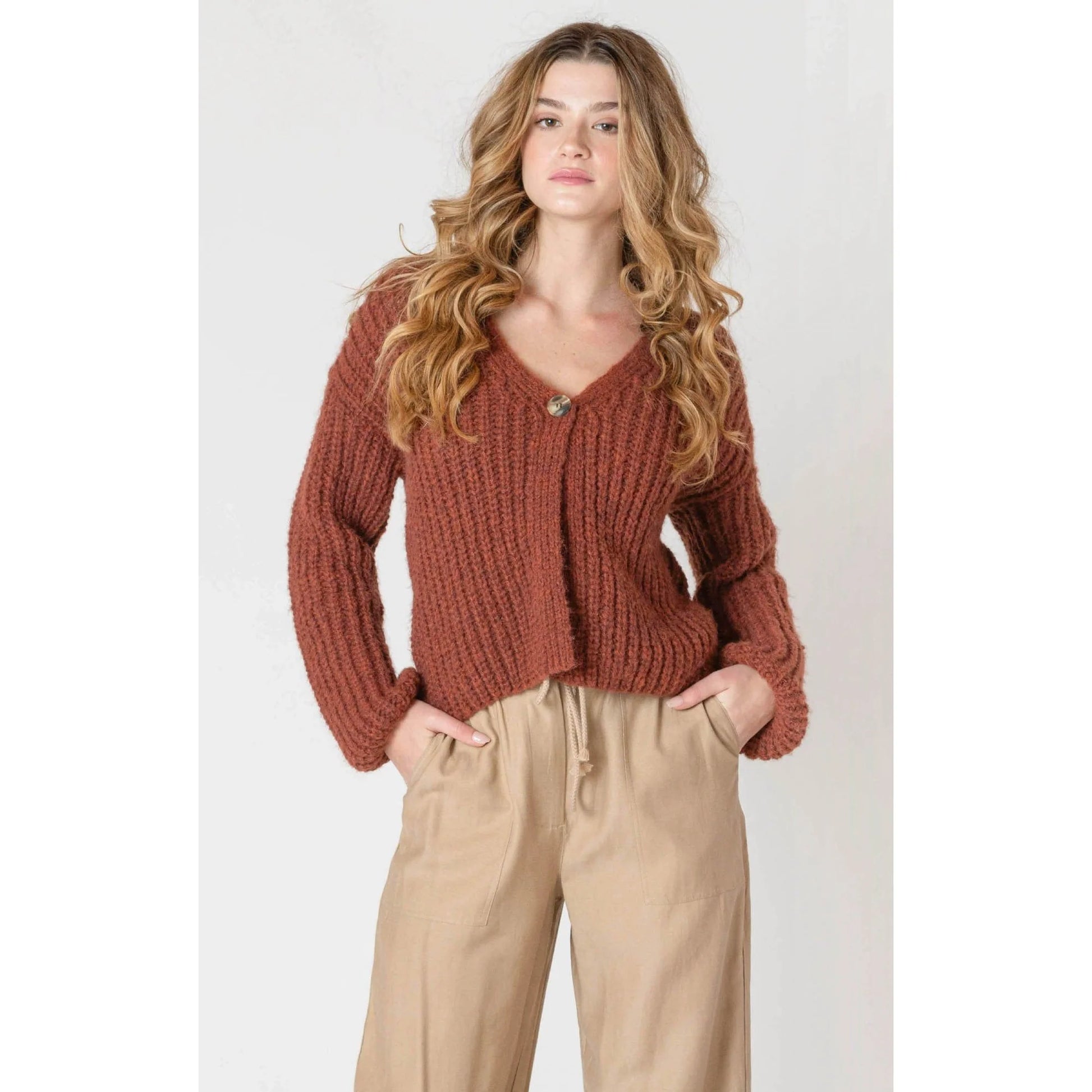 Cozy up in the Room 34 Single Button Cardigan, perfect for crisp fall days. Featuring a single button closure and long sleeves, this cardigan adds a playful pop of autumn color to your wardrobe while keeping you comfortably warm. Ideal for layering or wearing solo, it’s your go-to piece for effortless seasonal style.