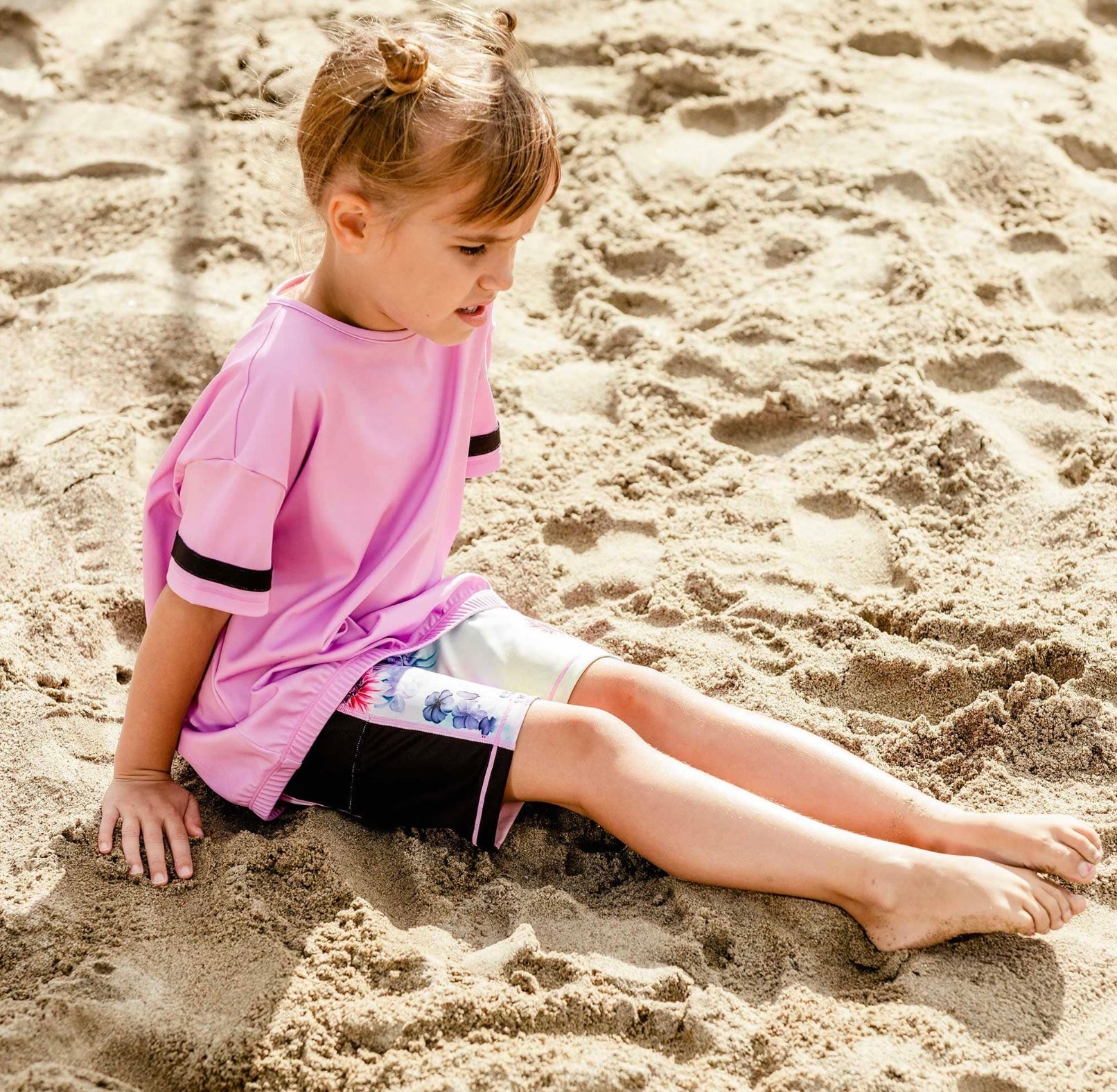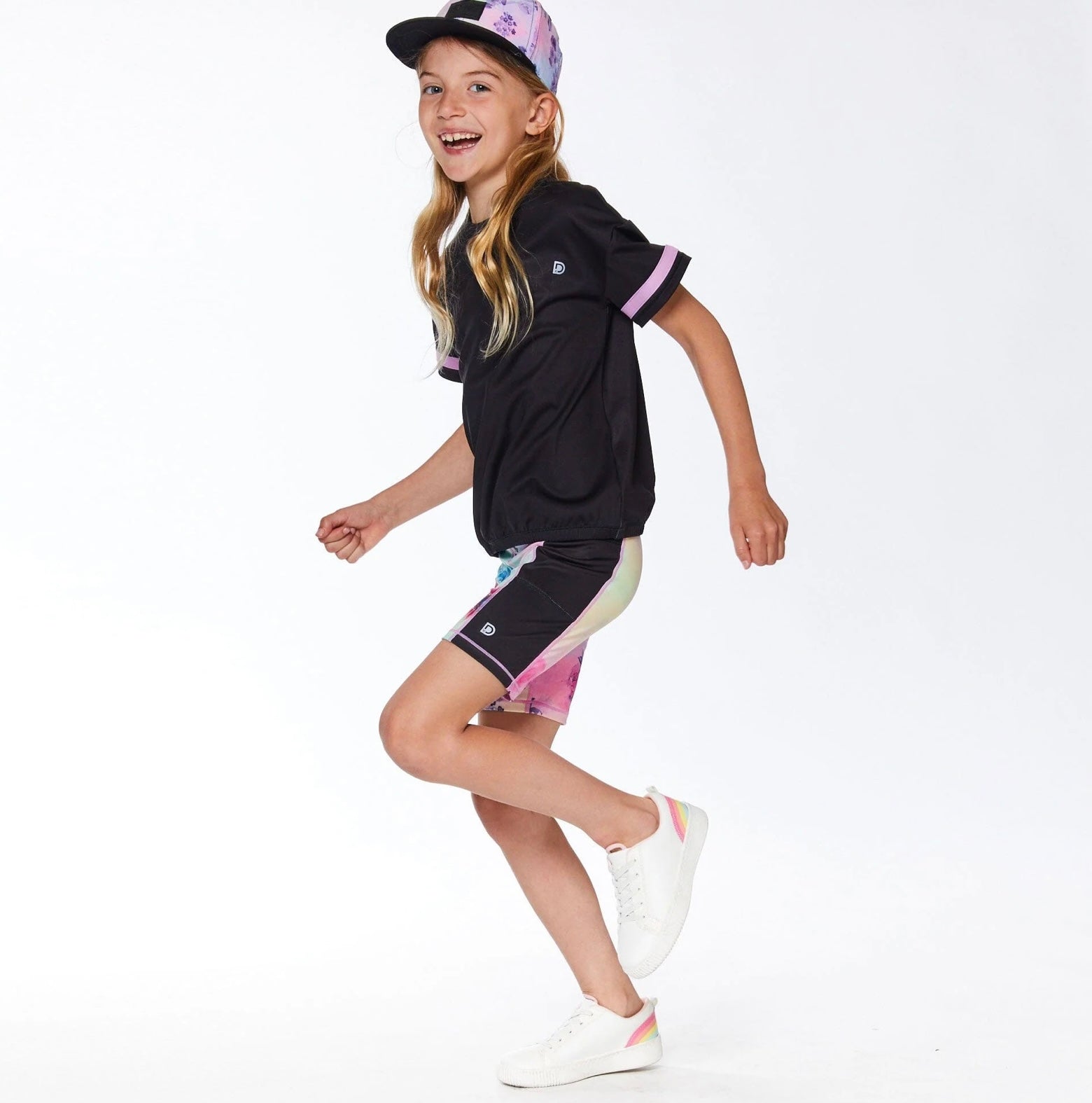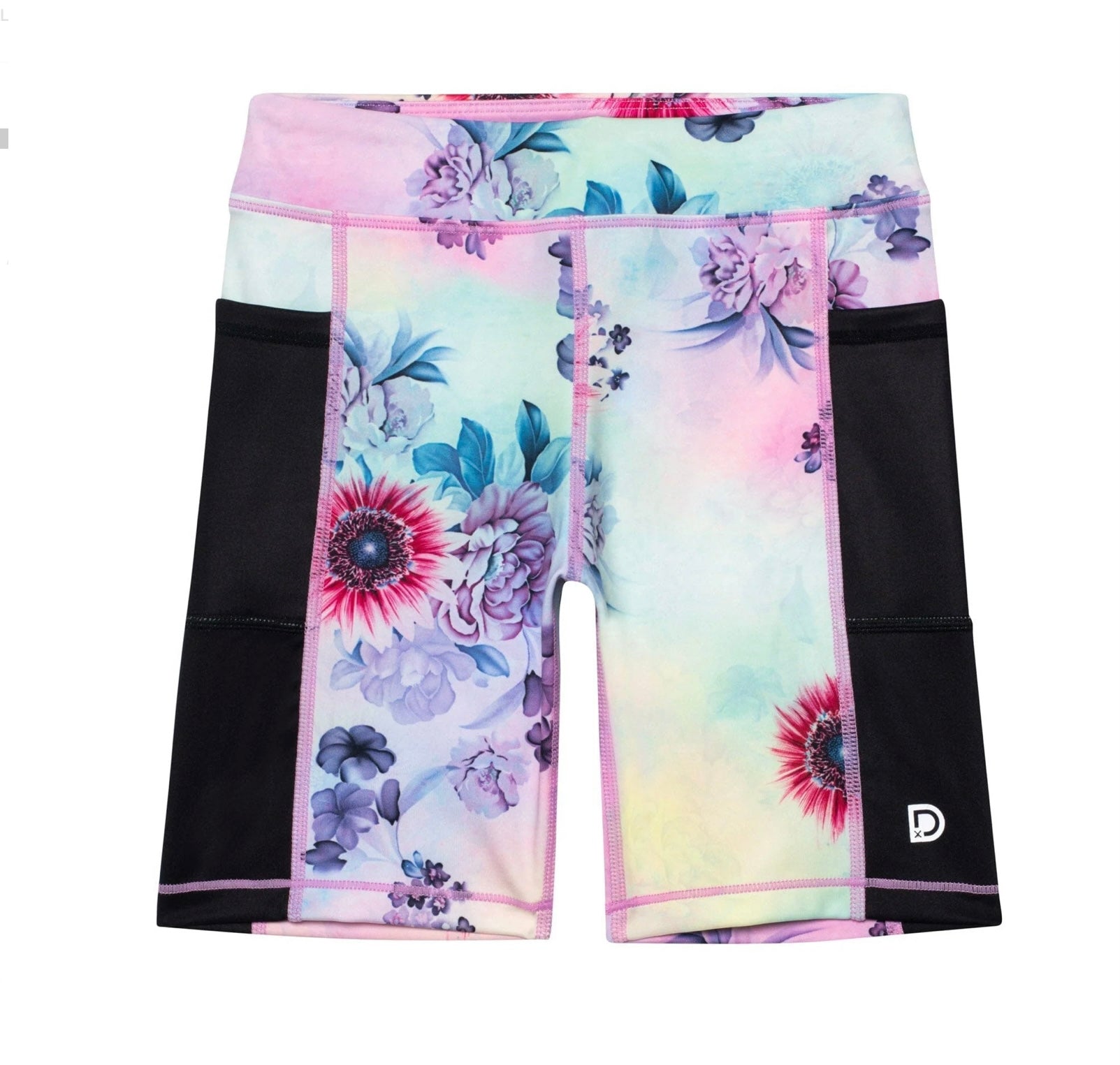 Whether she's dancing, playing sports, or running around on the playground, our Printed Athletic Biker Short Multicolor with Flowers is perfect for any active moment. Soft and stretchy in recycled REPREVE® fabric, this short features an allover floral print, an elastic waist, and contrast solid accents on each leg.