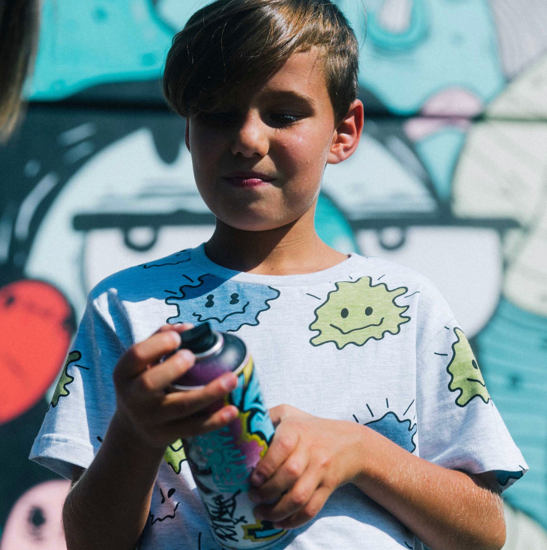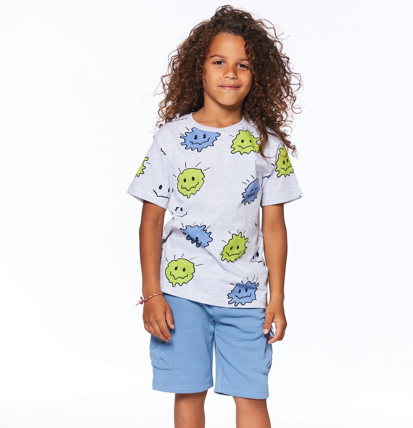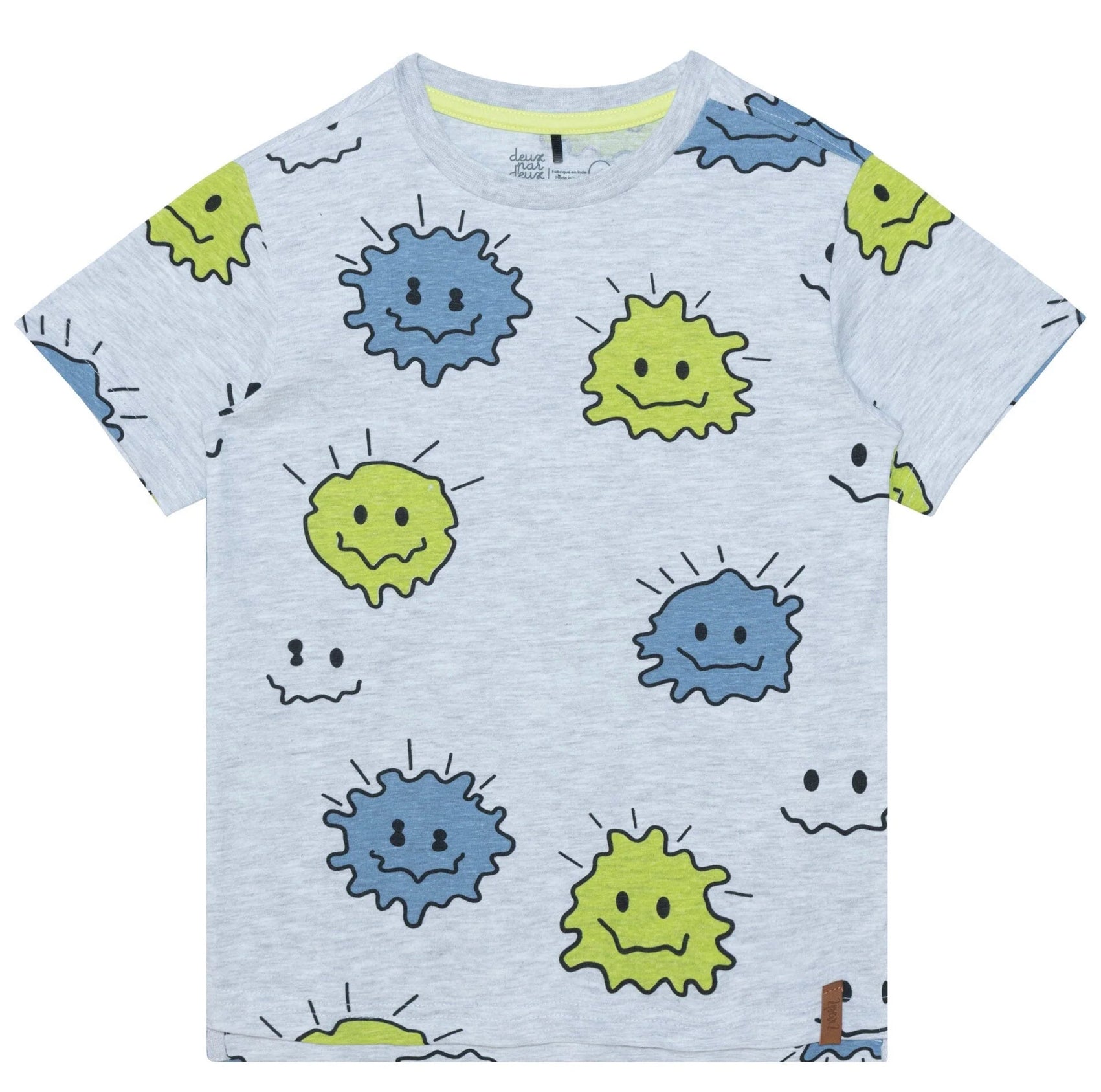 n allover print adds bold style to our Printed Cotton Jersey Tee Light Heather Grey. Made from soft cotton fabric, this lightweight tee features short sleeves, a crew neckline, and a blue and yellow graphic print. Mix and match with any of our French terry shorts, jogger pants, or twill bottoms.