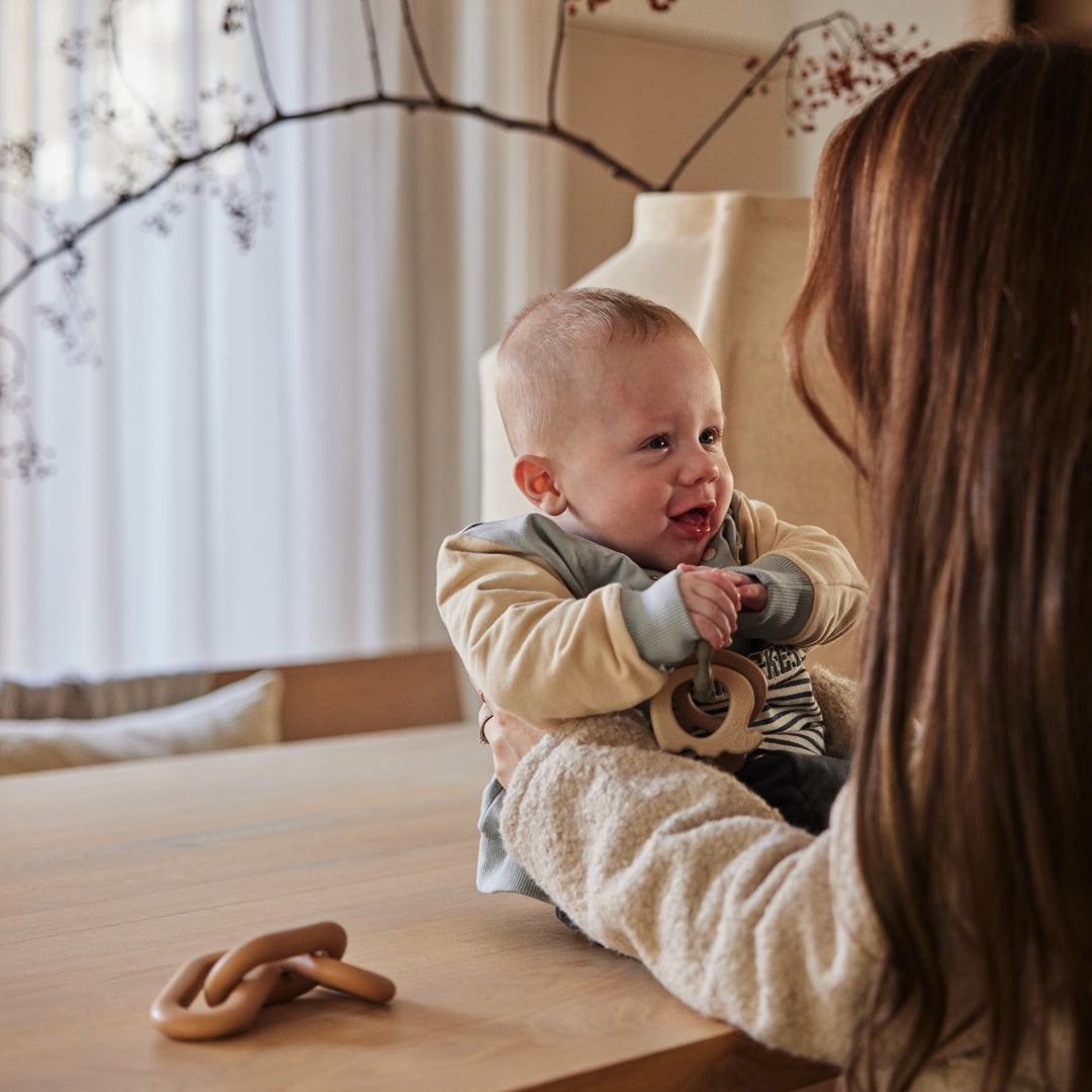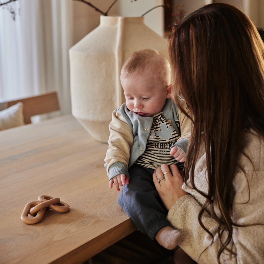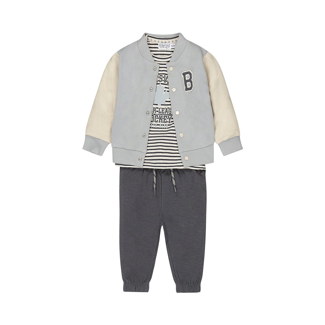Ready for a new day. This cool Dirkje set consists of a soft blue boys baseball vest with off white sleeves, a striped longsleeve and matching dark blue jogging pants. Made of soft materials so your little one can move around wonderfully. Perfect for fall and winter days!