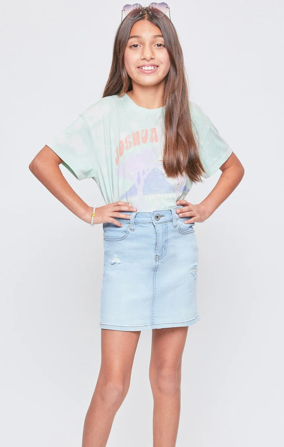 Hello fashionista! Show off her super-stylish side in our Girls' High-Rise Essential Denim Skirt. This high-waisted jean skirt sits high on the waist and is straight throughout the hips and thighs, hitting right above the knees. Featuring a 1-button closure with zipper, 4 pocket construction, and belt loops. We’ve also added some light distressing for an edgy feel! Pair this skirt with a cute blouse and sandals for a girly look, or wear it with a tee and sneakers for a sporty vibe.
